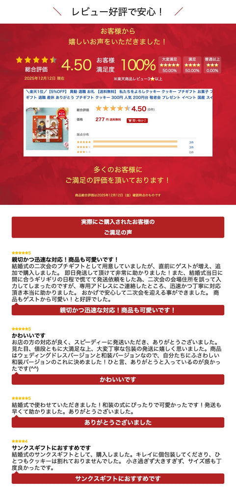 結婚式のサンクスギフトとして、購入しました。キレイに個包装してくださり、ひとつもクッキーは割れておりませんでした。 小さ過ぎず大きすぎず、サイズ感も丁度良かったです。