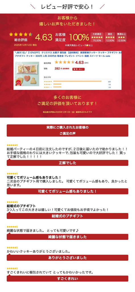 結婚パーティーの4日前に注文したのですが、2日後に届いたので助かりました!! お手頃な価格のわりには大きいクッキーで、包装も可愛いので大好評でした! 買って正解でした!!!!!