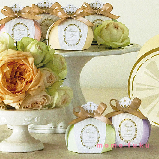 小さなクラウンとゴールドのリボンがキュートな、かぼちゃ風ボックスに入っています。