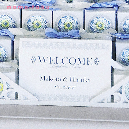 お二人の挙式日・お名前を入れられるので、ウェルカムオブジェとしてお使いいただくことができ、お見送りの際には、ゲストのみなさんにお渡しできるプチギフトに!