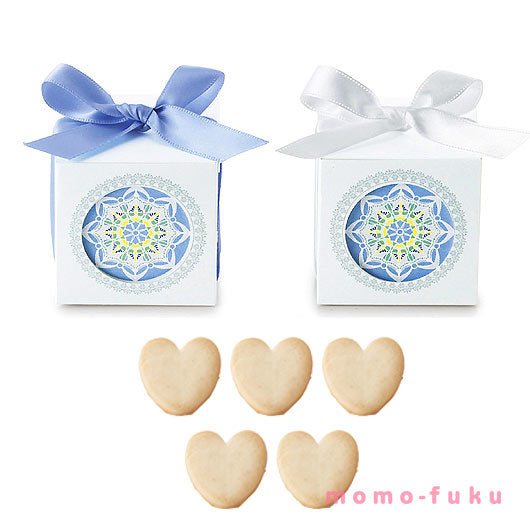 ブルーのステンドグラスをモチーフにした小箱には、ハートクッキーが入っています。サムシングブルーのおまじないをかけて、ゲストにお渡ししましょう!