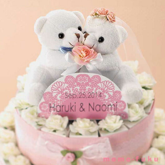 ピンクと白いバラの可憐なケーキの上に飾られたウェディングベアにゲストも思わずにっこり!