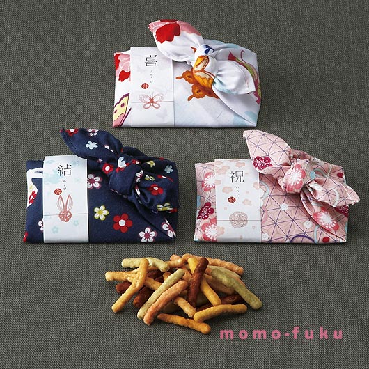 小粋な和柄のハンカチでラッピングされた、かわいい和風のプチギフトをご紹介します。ぜひハンカチとして使いたい美しい和柄が、ノスタルジックなムードを演出し、和装婚のお二人にぴったりのプチギフトです。ピンクの桜柄には「祝」、白の蝶々柄には「喜」、紺色のうさぎ柄には「結」と書かれたおしゃれな熨斗がついています。この和風の素敵なハンカチはどんな世代の方にも喜ばれることでしょう。