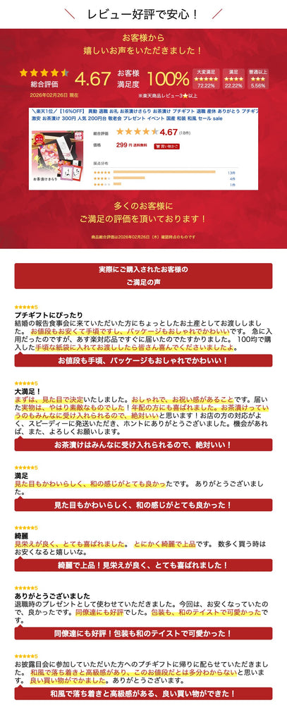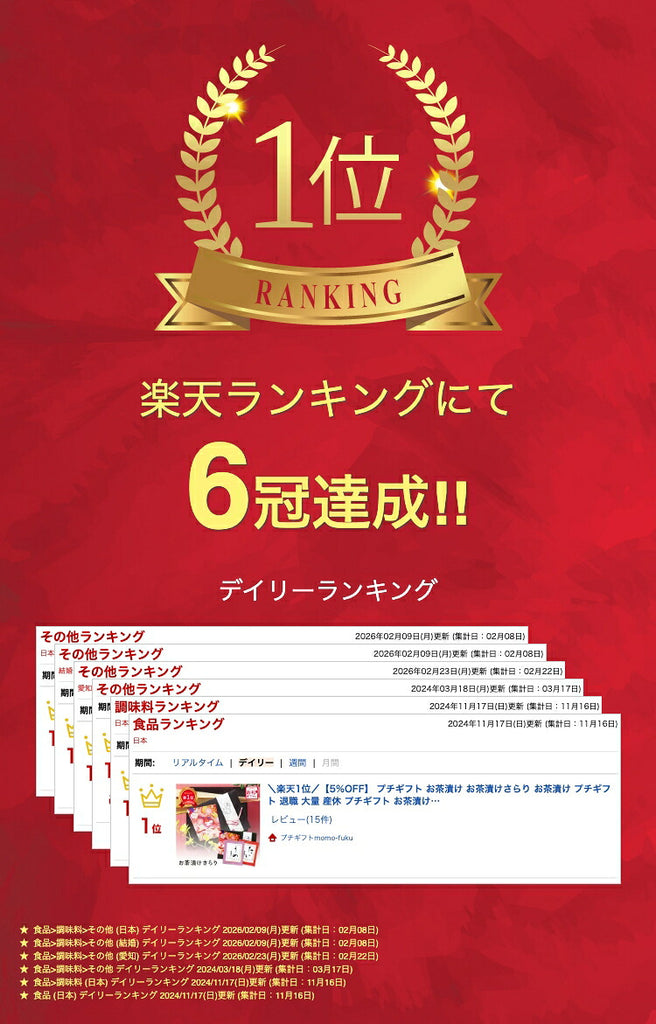 まずは、見た目で決定いたしました。おしゃれで、お祝い感があることです。届いた実物は、やはり素敵なものでした!年配の方にも喜ばれました。お茶漬けっていうのもみんなに受け入れられるので、絶対いいと思います!お店の方の対応がよく、スピーディーに発送いただき、ホントにありがとうございました。機会があれば、また、よろしくお願いします。