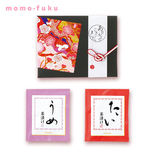 純和風テイストが新鮮なお茶漬けプチギフトです。夜食や小腹が空いた時にささっと食べられるお茶漬けを、上品な和風パッケージでご提供します。和の趣を感じさせるパッケージには「うめ」と「たい」、人気のふたつの味をセットにしました。どちらも日本の伝統的な味わいを楽しめる逸品。