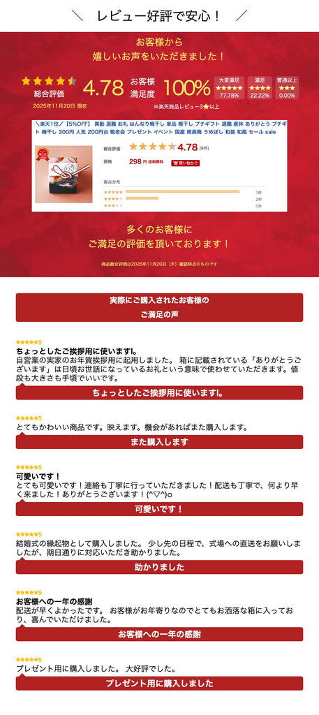 退職ゴルフ参加プチ御礼品として購入しました。 人気ゴルフボールだと3個入りで高額となるため人数も多く御礼に気持ちを伝えたくてプチ御礼で全員に渡しました。 この程度の商品なら気軽にあげられ、貰った方も気兼ね無く、箱のデザインも可愛いので女性陣には好評、暑い日など熱中症対策としてもちょっとおしゃれで気が利いた美味しい南高梅はとても好評かと思います。 また、機会があればプチ御礼品として購入したいと思います。
