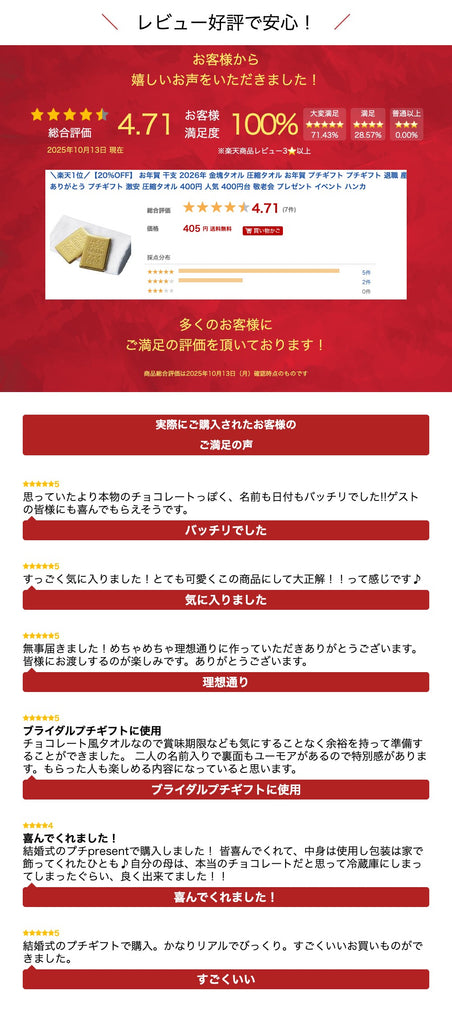 こんにちは!まずはメールの対応が早すぎてびっくりしました!(笑) 注文させていただいた金かいのタオルは、二次会の会場でタワー型に積み重ね、キラキラしてひときわ目立っていました。あげても実用的なのでおすすめです!他の店でも売っていましたがmomo-fukuは断然安かったです!