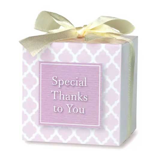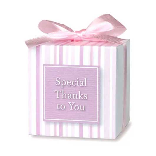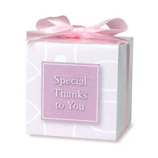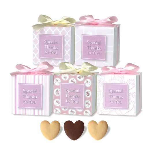 5種類のピンクの箱の中には、ハート型のクッキーを入れました。パッケージの中央には「Thanks for You」の文字が記されており、おふたりの感謝の気持ちをしっかりと伝えてくれます。