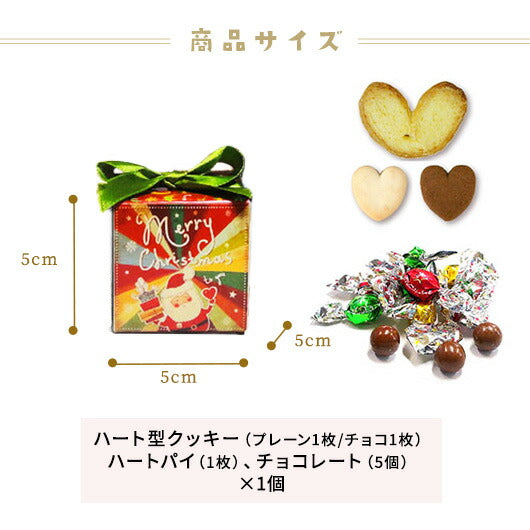 心温まるサンタや雪だるまのイラストが施されたパッケージには、5種類のデザインをご用意。光沢感のあるリボンが、特別感を引き立ててくれます。箱の中には、ハートクッキー2枚、ハートバイ1枚、そしてチョコレート5個が詰め合わせてあり、さまざまな味を楽しめる贅沢なプチギフトです。大人も子供も思わずにっこりする美味しさで、クリスマスシーズンの結婚式や二次会、さらにはクリスマスパーティーのプレゼントにもぴったりです。