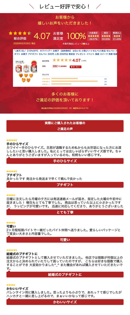 日本の伝統美をアレンジした和風テイストのプチギフトは、幅広い年齢層の方やゲストにご好評いただける商品です。赤・白・黒の和風モダンな小筒には、しょうゆ味が好評なハートせんべい5枚を入れました。可愛らしい「ありがとうこざいます」のタグが付いており、感謝の気持ちをしっかりと伝えます。