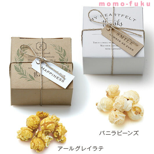 爽やかなホワイトと、クラフト感溢れるブラウンの2種類のおしゃれな小箱に入ったプチギフト。中身は、みんな大好きなポップコーンです。