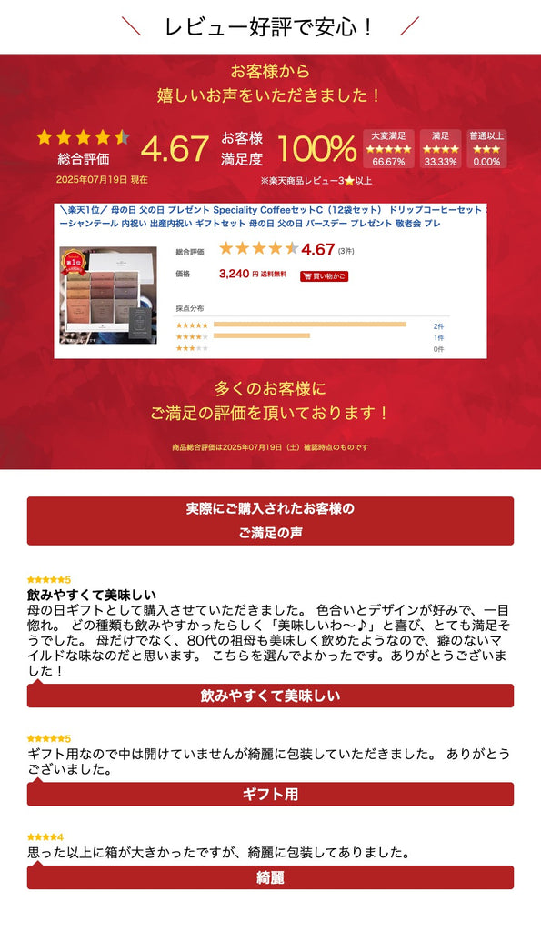 母の日ギフトとして購入させていただきました。 色合いとデザインが好みで、一目惚れ。 どの種類も飲みやすかったらしく「美味しいわ~♪」と喜び、とても満足そうでした。 母だけでなく、80代の祖母も美味しく飲めたようなので、癖のないマイルドな味なのだと思います。 こちらを選んでよかったです。ありがとうございました!