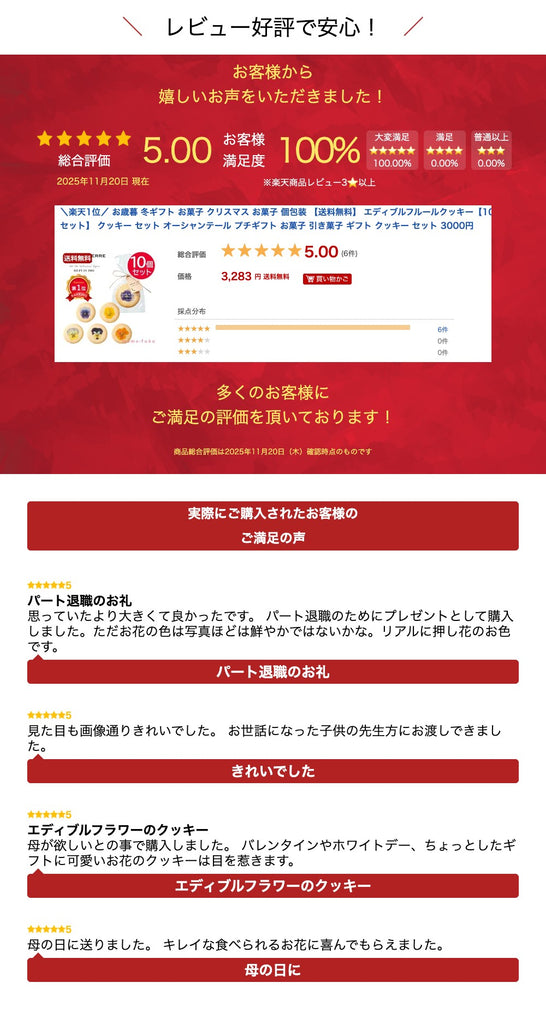 大切な方へのプチギフトとして、華やかなエディブルフラワーを添えたクッキーはいかがですか。卵を使用せず、まろやかでやさしい味わいが特徴のこのクッキーは、特別な日にぴったりの贈り物です。結婚式のプチギフトとしても人気で、個包装なので多くの方に気軽にお渡しできます。エディブルフラワーは、安全に栽培され乾燥されたものを使用しており、安心して召し上がっていただけます。クッキーの上品なデザインと美味しさが、結婚式の引き出物や、退職時のお礼としても大活躍。おしゃれで特別感のあるプチギフトをお探しの方におすすめです。