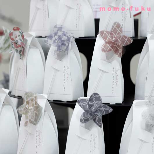 小さな華たちが祝福の風をおふたりのもとに届けます くるくると可愛らしく回る、華の形の風車がついたプチギフト。シンプルな白のパッケージに映える和柄が式を華やかに彩ります。おふたりの門出にふさわしい祝福の風を舞い込んでくれる。