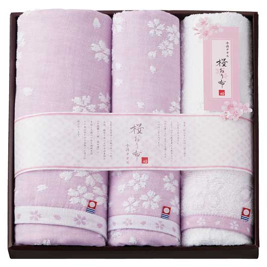 古来、桜ほど日本人の心に深く根ざした花はありません。平安時代以後の日本では単に「花」と言えば桜の事を指す花の代名詞にもなっています。それほど日本では長い間、愛されてきた桜。桜は、その花言葉にもあるように「心の美しさ」までをも感じさせ、小さな花がたくさん集まり、ほのかな淡いピンクのグラデーションに色づく光景は、日本人の心に染み入ります。そんな桜をモチーフにした『今治タオル 桜おり布』は、桜と同様、長く愛され続けているシリーズです。タオルだけでなく、商品のパッケージにも桜のモチーフをあしらっています。