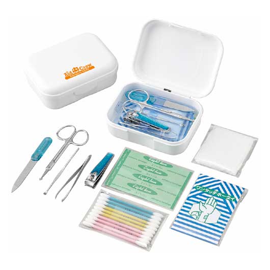 ●セット内容:カラー綿棒×10、キズテープM・コットンパフ×各3、専用ケース(11×8×4cm)・爪切り・エチケットハサミ・耳かき・毛抜き兼ピンセット・爪ヤスリ・ワンタッチ包帯×各1