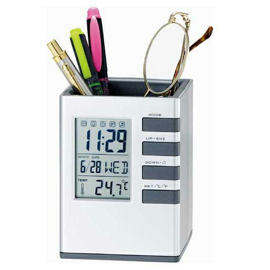 ペンや小物などフリーに収納出来る使いやすいデスクスタンドです。デジタル表示も見やすく、機能も充実しています。 機能:時計、アラーム、スヌーズ、カレンダー、温度計、カウントダウンタイマー、ペンスタンド