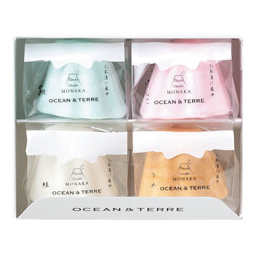 ●内容:最中(鯛茶漬け)9g×1、最中(たらこ茶漬け)9g×1、最中(鮭茶漬け)10g×1、最中(梅茶漬け)9g×1