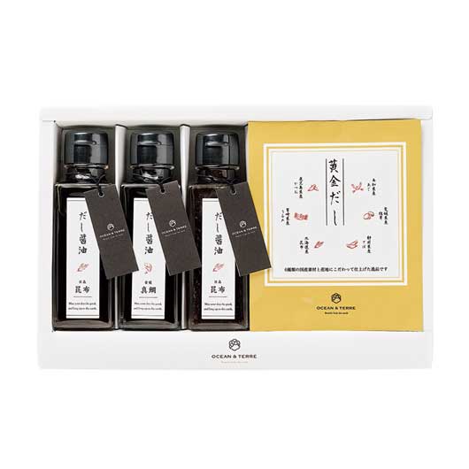 ●内容:北海道日高昆布醤油100ml×2、愛媛県真鯛醤油100ml×1、黄金だしパック8g×8