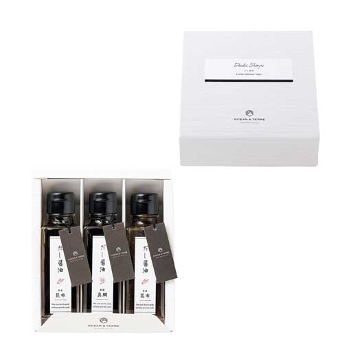 ●内容:北海道日高昆布醤油100ml×2、愛媛県真鯛醤油100ml×1