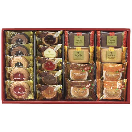 ●セット内容:ロシアケーキ(マカロンストロベリー・リッチビター) ・サンドクッキー(ココア・バニラ) ・スイートマロン(メープル・キャラメル)×各2、ロシアケーキ(フラワーキウイ) ・プチガトー(ストロベリー・ブルーベリー・オレンジ・ミルクチョコ・ホワイトチョコ) ×各1