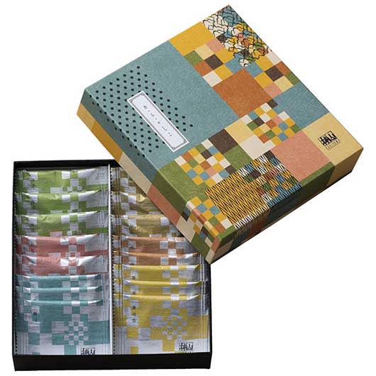 伝統細工・寄木造りをアレンジしたモダンでカラフルなパッケージは、カジュアルながらも高級感があり、様々な手土産に最適です。中には一口サイズのおかきを6種類詰合せました。