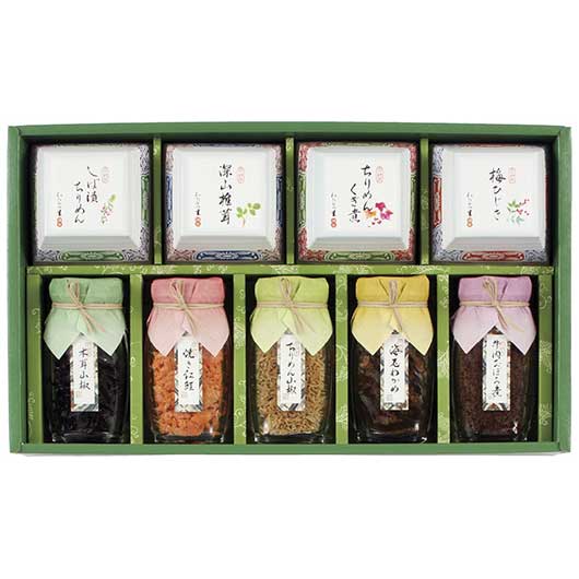 ●セット内容:海老わかめ(65g)・牛肉おぼろ煮・深山椎茸(各60g)・木耳山椒(55g)・ちりめんくぎ煮・梅ひじき・しば漬ちりめん(各50g)・焼き紅鮭(43g)・ちりめん山椒(30g)×各1