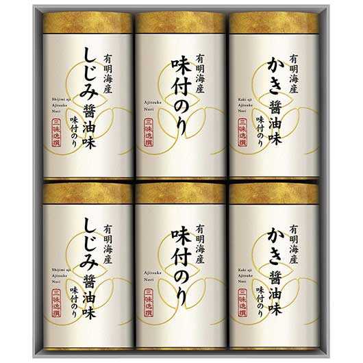 有明海産の風味豊かな味付海苔としじみ醤油味、かき醤油で仕上げた味付海苔の3種類の味わいを楽しめるバラエティギフトです。