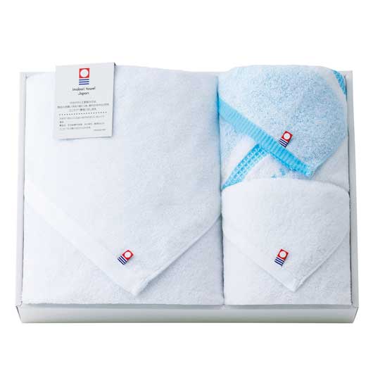 ●商品サイズ:白フェイスタオル320mm×850mm・ワッフルボーダーフェイス ブルー320mm×880mm・バスタオル700mm×1300mm