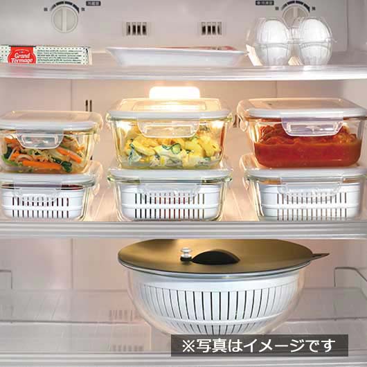 ●材質:本体:耐熱ガラス・蓋:ポリプロピレン(-20℃〜120℃)・蓋パッキン:シリコーンゴム・ざる:ポリプロピレン(-20℃〜140℃)