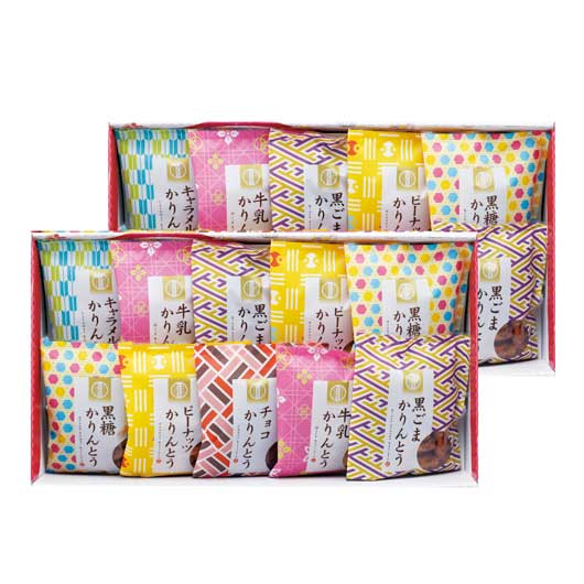 様々なフレーバーを楽しめるかりんとうの詰合せです。 黒ごまかりんとう 香ばしい黒ごまで風味豊かに仕上げました。 チョコかりんとう チョコレートを生地にたっぷりと練り込み、カリッとかる〜い食感に仕上げました。 キャラメルかりんとう キャラメルを生地にたっぷりとかけ、しっとりと仕上げました。 ピーナッツかりんとう ピーナッツの香ばしさと甘みを調和させ、味わい深く仕上げました。 黒糖かりんとう 風味豊かなハチミツ入りで、サクサクッとした食感に仕上げました。 牛乳かりんとう 牛乳を生地に練り込み、サクッと軽い食感