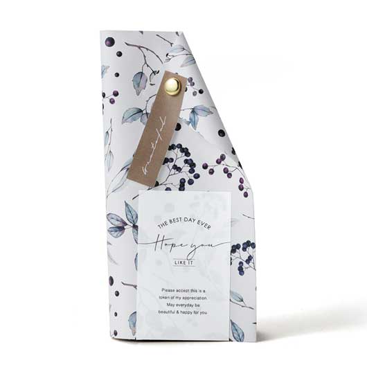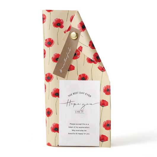 くるっと折り曲げられた形が可愛らしいポピーやリーフ柄のデザインが、お出かけしたくなる気分にさせてくれます。このユニークな形は、柔らかさや優しさを感じさせる魅力があります。