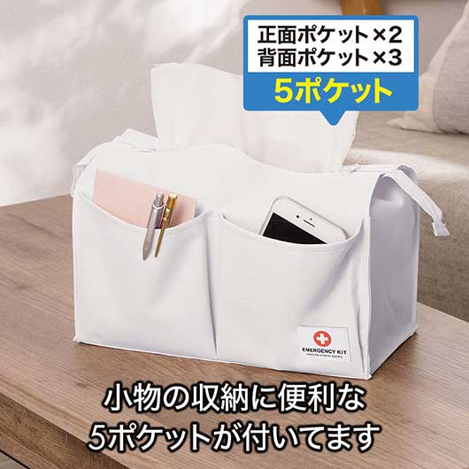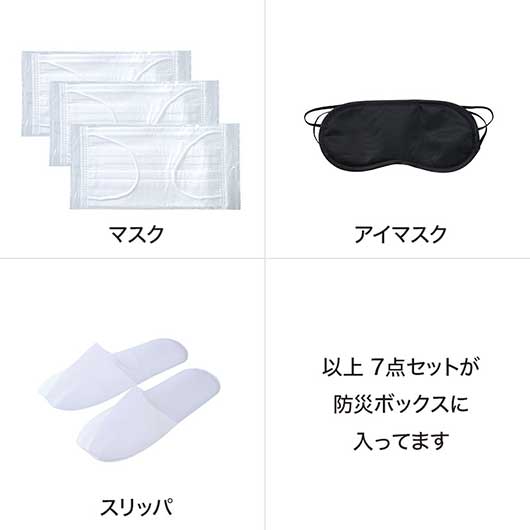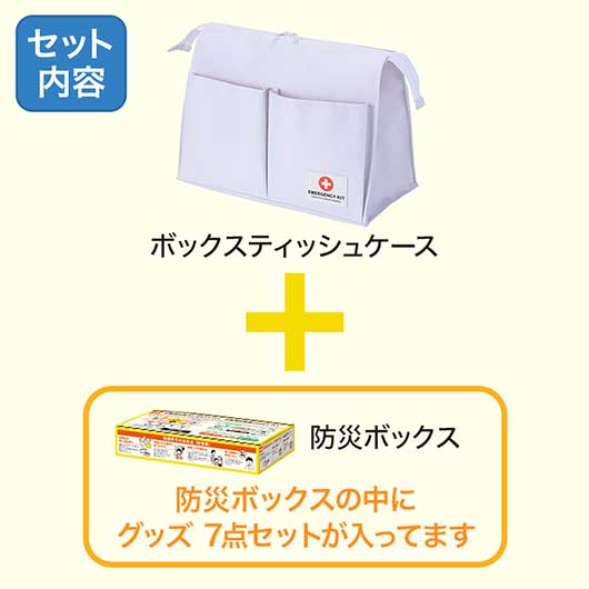 いつも身近にあるティッシュケースが、実は防災グッズのセットだったら!? 防災グッズの新提案です! 日常的に生活空間にあるボックスティッシュケースの内部に、 防災グッズ7点セット入りの「防災ボックス」が入っています。 その中身は… 不織布三角巾・圧縮不織布タオル(×3個)・LEDライト・アルミシート・ 不織布マスク(×3個)・アイマスク・スリッパです。 避難時、あるいは避難直後・避難所生