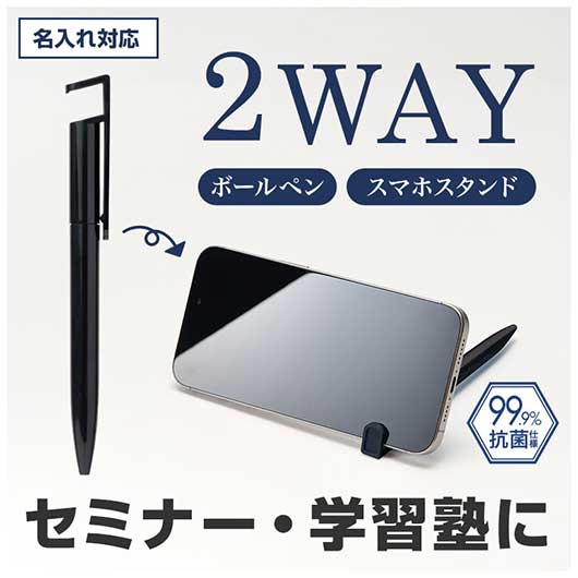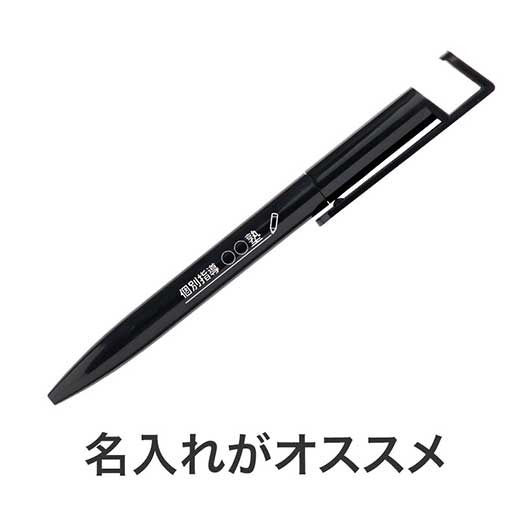 スマホスタンドとしても使える、便利なボールペンです。 ノベルティグッズの王道といわれる「ボールペン」、 その実用性は説明するまでもなく、 本商品はさらにスマホスタンドとして使え、抗菌仕様でもあり、付加価値◎なアイテムです! 抗菌率99.9%以上、本体に抗菌素材が練りこまれています。 ※すべての菌に対して抗菌効果があるわけではありません 企業名・ショップロゴ等を名入れすれば、簡単にオリジナルグッズが完成いたします。 長3封筒での郵送も可能で、DM同梱物としても開封率アップ施策にご利用いただけます。 比較的安価ですので、「バラマキ」用アイテムとしても、いかがでしょうか? 展示会や各種説明会ではもちろん、 学習塾やセミナーでの集客にも、ご活用ください。 本商品は「ブラック」ですが、他色もあわせてご検討ください。