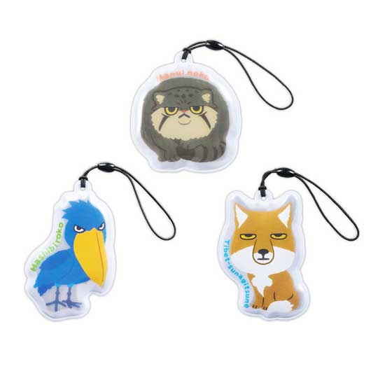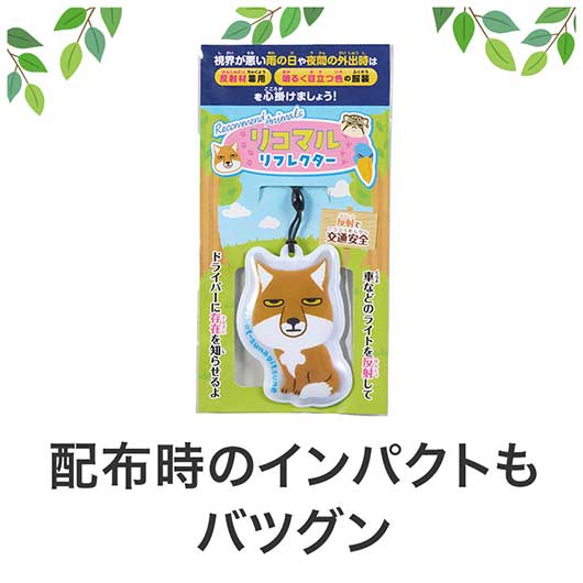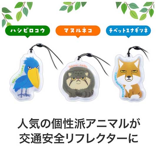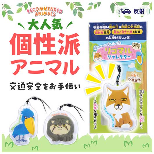いま、注目が集まりつつある個性派アニマル、 ハシビロコウ・マヌルネコ・チベットスナギツネの3種がリフレクターになりました! (3種取り混ぜとなります) リフレクターとは、自ら発光するものではなく、車等のライトの光を反射、 キラキラ光って、その存在を知らせる交通安全グッズです。 暗い夜道で「もしも」の事故を未然に回避できる可能性を高めてくれます。 交通安全イベント等での配布にいかがでしょうか? 長3封筒に入りますので、郵送での配布もご検討いただけます。 動物病院・動物園、ファミリー向けイベントでの活用も、おススメいたします。 話題性抜群のレアアニマルをモチーフにした「リコマル」シリーズ、他にも各種ございます♪