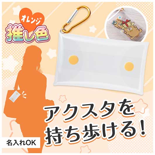 近年、大きなムーブメントになっている「推し活」での利用にぴったり! 「推し」の色にあわせられる、 ブラック・ホワイト・レッド・ブルー・オレンジ・ピンク・グリーンの7色展開! (本商品は「オレンジ」です) 本体はクリア(透明)仕様で、 アクスタ(アクリルスタンド)や、推し関連の小物を収納するのがおススメ♪ 「見せる収納」でおしゃれに、スタイリッシュに持ち運び・・・ いや、推しを「連れて」いきましょう! カラビナ付きなので、バッグ等にもカンタンに取り付けられます。 「推しカラー」のプラボタンを外せばフルオープン(全開)状態になり、お掃除もラクラク。 推しグッズ以外でも、イヤフォン・小銭・薬・鍵やエコバッグ等、いろいろ便利に収納&持ち運びできます。 企業名・ショップロゴ・イメージキャラクター等の名入れも可能! PR効果抜群のオリジナルグッズが簡単に完成し、物販品としてもご利用いただけます。 長3封筒での郵送も可能なので、DM開封率アップ施策にもご活用ください。 他の「推し活」関連グッズも、是非あわせてご検討ください。