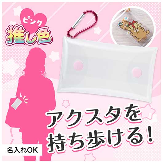 近年、大きなムーブメントになっている「推し活」での利用にぴったり! 「推し」の色にあわせられる、 ブラック・ホワイト・レッド・ブルー・オレンジ・ピンク・グリーンの7色展開! (本商品は「ピンク」です) 本体はクリア(透明)仕様で、 アクスタ(アクリルスタンド)や、推し関連の小物を収納するのがおススメ♪ 「見せる収納」でおしゃれに、スタイリッシュに持ち運び・・・ いや、推しを「連れて」いきましょう! カラビナ付きなので、バッグ等にもカンタンに取り付けられます。 「推しカラー」のプラボタンを外せばフルオープン(全開)状態になり、お掃除もラクラク。 推しグッズ以外でも、イヤフォン・小銭・薬・鍵やエコバッグ等、いろいろ便利に収納&持ち運びできます。 企業名・ショップロゴ・イメージキャラクター等の名入れも可能! PR効果抜群のオリジナルグッズが簡単に完成し、物販品としてもご利用いただけます。 長3封筒での郵送も可能なので、DM開封率アップ施策にもご活用ください。 他の「推し活」関連グッズも、是非あわせてご検討ください。