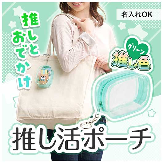 流行の「見せる収納」で、おしゃれに小物を持ち運びできるミニポーチです。 付属のナスカンで、かばん等にカンタン取り付け。 PVC素材でクリア仕様なので、中身をしっかりアピールできます。 「推し活」ジャンルでは、マストアイテムの「ぬいポーチ」として大活躍! 小型のぬいぐるみやアクリルスタンド等、「推し」を連れ歩くのにピッタリなんです♪ 「推し」の色にあわせられる、 レッド・ブルー・イエロー・ピンク・グリーンの5色展開! (本商品は「グリーン」です) 企業名・ショップロゴ・イメージキャラクター等の名入れも可能! PR効果抜群のオリジナルグッズが簡単に完成し、物販品としてもご利用いただけます。 他の「推し活」関連グッズも、是非あわせてご検討ください。