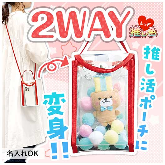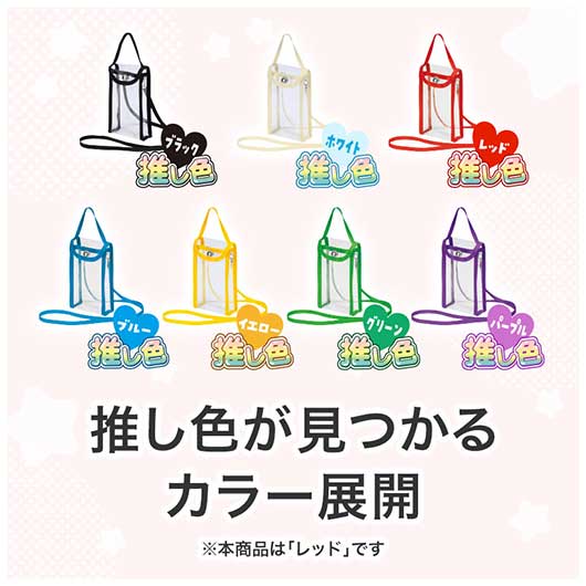 ショルダーバッグ・ポーチ、どちらでも使える便利な 2wayアイテムです。 付属のショルダーベルトは、どなたでも簡単に着脱可能。 ベルトを取り外せば、かわいいポーチになります。 スマホを携帯するのに便利な「スマホショルダー」として、 ショルダーベルトを外して、小型のぬいぐるみやアクリルスタンドを収納すれば、 「推し活」のマストアイテム「ぬいぐるみポーチ」として、 どちらの使い方でも大人気、幅広い需要が見込めるアイテムです。 PVC素材のクリア仕様なので、中身をおしゃれにアピール可能♪ フタ部分はマグネット式ボタンで、カンタン開閉。 マチが約4cmあり、スマホやミニぬいぐるみ以外にも、 お財布やモバイルバッテリー等、いろいろ入れられます。 「推し」の色にあわせられる、 ブラック・ホワイト・レッド・ブルー・イエロー・グリーン・パープルの7色展開! (本商品は「レッド」です) 企業名・ショップロゴ・イメージキャラクター等の名入れも可能! PR効果抜群のオリジナルグッズが簡単に完成し、物販品としてもご利用いただけます。 他の「推し活」関連グッズも、是非あわせてご検討ください。