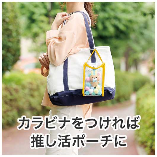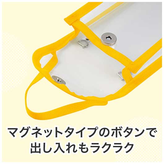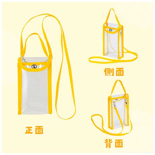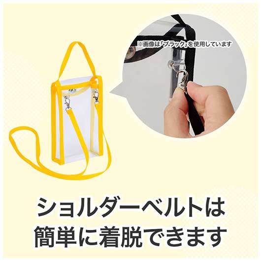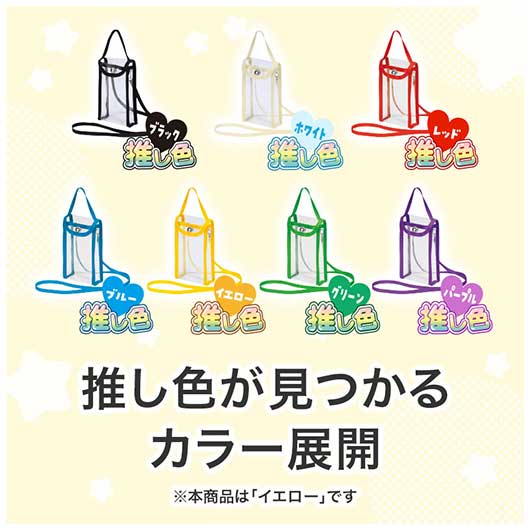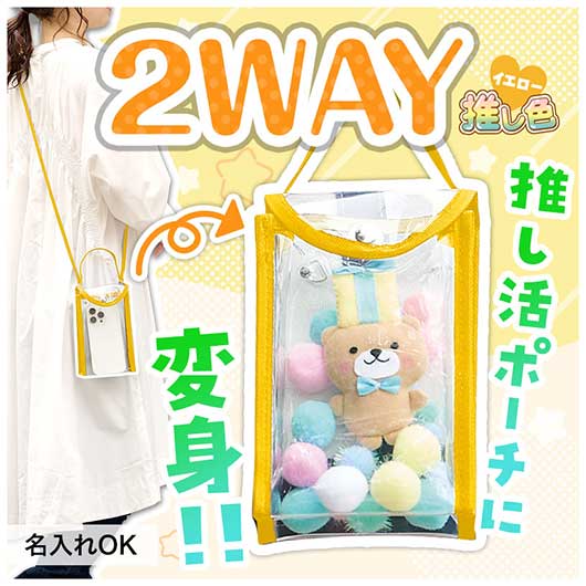 ショルダーバッグ・ポーチ、どちらでも使える便利な 2wayアイテムです。 付属のショルダーベルトは、どなたでも簡単に着脱可能。 ベルトを取り外せば、かわいいポーチになります。 スマホを携帯するのに便利な「スマホショルダー」として、 ショルダーベルトを外して、小型のぬいぐるみやアクリルスタンドを収納すれば、 「推し活」のマストアイテム「ぬいぐるみポーチ」として、 どちらの使い方でも大人気、幅広い需要が見込めるアイテムです。 PVC素材のクリア仕様なので、中身をおしゃれにアピール可能♪ フタ部分はマグネット式ボタンで、カンタン開閉。 マチが約4cmあり、スマホやミニぬいぐるみ以外にも、 お財布やモバイルバッテリー等、いろいろ入れられます。 「推し」の色にあわせられる、 ブラック・ホワイト・レッド・ブルー・イエロー・グリーン・パープルの7色展開! (本商品は「イエロー」です) 企業名・ショップロゴ・イメージキャラクター等の名入れも可能! PR効果抜群のオリジナルグッズが簡単に完成し、物販品としてもご利用いただけます。 他の「推し活」関連グッズも、是非あわせてご検討ください。