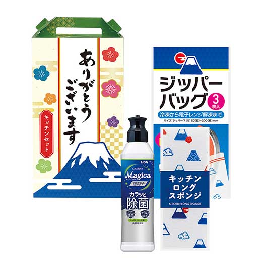 大切な方に、感謝の気持ちとともにお渡ししたいギフトセットです。 本商品のセット内容は、いくつあっても嬉しいキッチンアイテム、下記3点です。 【ライオン CHARMY Magica(速乾+カラッと除菌 シトラスミントの香り)220ml】  油汚れがスッキリ落ちるだけではなく、圧倒的な水切れスピードで食器が早く乾きます。  その上、除菌もできる人気商品!嬉しいシトラスミントの香りです。 【キッチンロングスポンジ】  富士山のポップなデザインが嬉しいスポンジは、ロングタイプなので細長いグラス等を洗うのに便利です。  消耗品であるキッチンスポンジは、いくつあっても困りません。 【ジッパーバッグ(3枚入)】  富士山デザインのジッパーバッグは、汁モレも安心な「Wジッパー」仕様!  厚さ0.06mmで耐久性もばっちり、もちろん食品検査済みで安心です。  食品の冷凍保存はもちろんのこと、レンジ解凍にも対応しています。  しかも嬉しい、3枚入り! パッケージには手触りの良い上質紙を使用、しっかりとしたつくりです。 ただまとめる、セットにする、目的だけではなく、 そのデザインも含め、受け取った方の喜びや、開封するまでのワクワク感を演出できる仕上がりです。 セット内容と同じく、デザインモチーフは「富士山」です。 「ありがとうございます」とのメッセージ入りで、感謝の気持ちを伝えやすいパッケージです。 店頭に並べても、多くの方の目を引いてくれることでしょう。 お渡しした方の「持ち帰りやすさ」も考え、持ち手もつけたこだわりのパッケージです。 大きなお買い物での成約プレゼント、イベント来場プレゼント、抽選会の景品等、使い方は様々です。 集客に、イベントの盛り上げに、なにより大切なお客様の笑顔のために、是非ご利用ください。 他の「ギフトセット」も、あわせてご検討ください。