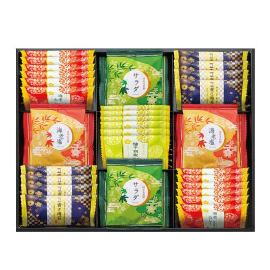 ●海老カレー煎餅 ×12枚、青さ海苔煎餅 ×8枚、海老塩煎餅 ×6枚、サラダ煎餅 ×6枚、柚子胡椒煎餅 ×6枚(合計38枚)