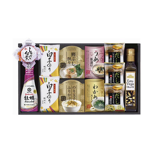 ●セット内容:たまごスープ(5.4g)×3、白子味のり(8切5枚)×2、オリーブオイル(229g)・キッコーマン牡蠣だししょうゆ(200ml)・島の香しそのり佃煮(80g)・わかめスープ(5.3g×2袋)・のり玉子ふりかけ(4.5g×2袋)・うめ茶漬け(4.3g×2袋)・鰹ぶし削り(2g×3袋)×各1