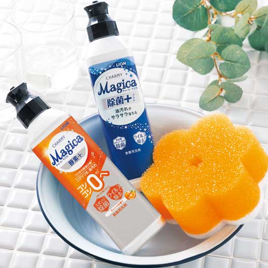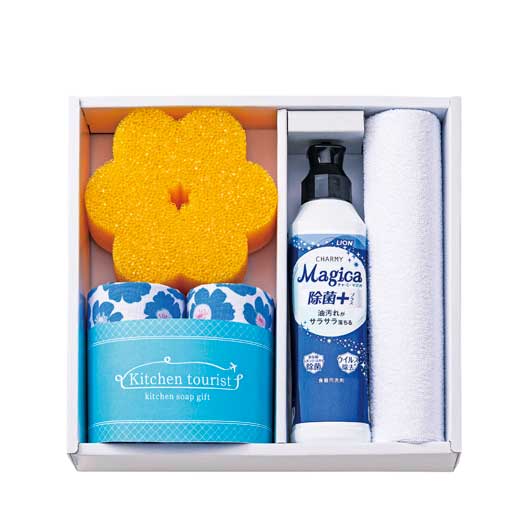 ナノ洗浄でベタつく油汚れもサラサラ落とす食器用洗剤・チャーミーマジカと、今治タオルやマイクロファイバークロスがセットになった、役立つキッチン洗剤ギフトです。かわいらしい花型のスポンジとチャーミーマジカで食器洗いを楽しくサポートします。