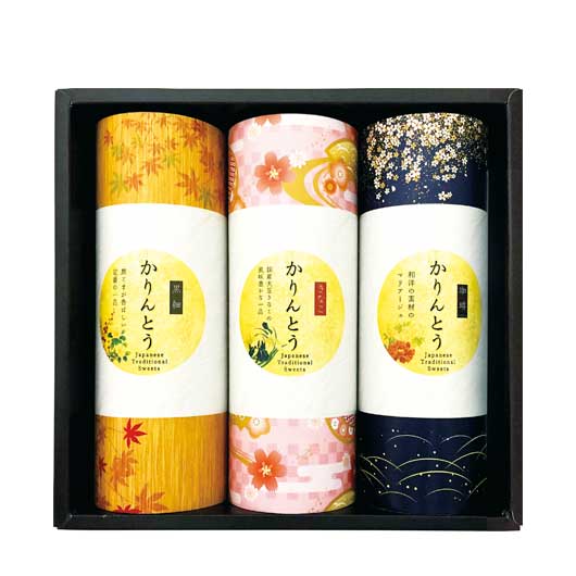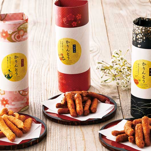 国産きなこをまぶし、甘さを抑え少し塩味に仕上げた懐かしい味のきなこかりんとうと、昔ながらの定番の味クセになる美味しさの風味豊かな黒かりんとう、珈琲の香ばしさが甘みを引き立ててくれる大人味の珈琲かりんとう、沖縄産黒糖を使用した黒糖の風味が広がる、ツヤが美しい沖縄黒糖かりんとうの詰合せです。