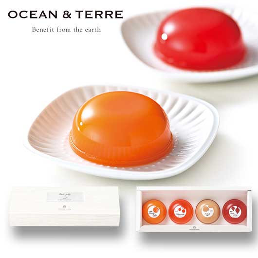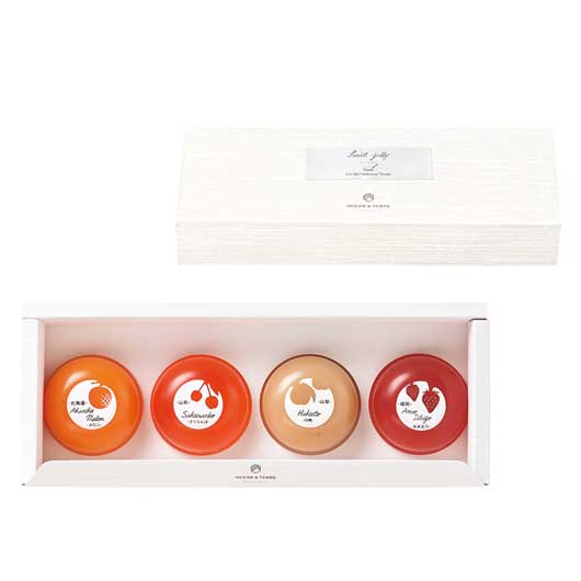 北海道の赤肉メロン、山形県のさくらんぼ、山梨県の白桃、福岡県のあまおう苺を使用した、上品な味わいのフルーツゼリーをセットにしました。それぞれの地域の旬のフルーツを贅沢に使い、フルーツ本来の甘みと香りを楽しめる仕上がりです。
