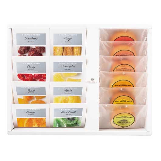 みずみずしさを残したドライフルーツと、大地と太陽の恵みをぎゅっと一層一層に詰め込んだフルーツバームクーヘンのセットです。