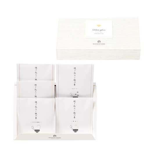 ●内容:炊き込みご飯の素(2合用)38g×5、ずわい蟹13g×1、金目鯛1切×1、帆立2個×1、うなぎの蒲焼き13g×1、あさり30g×1、三つ葉0.2g×5、白煎りごま1g×5