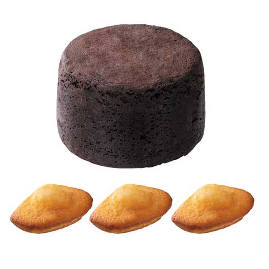 芳醇なレモンの香りが決めてのプレーンのマドレーヌ。ぷっくりと焼き膨らんだ形がポイント。【とろ~り濃厚フォンダンショコラ】ベルギー産チョコ生地の中に、カカオビターチョコを閉じ込めた大人リッチな濃厚フォンダンショコラ。