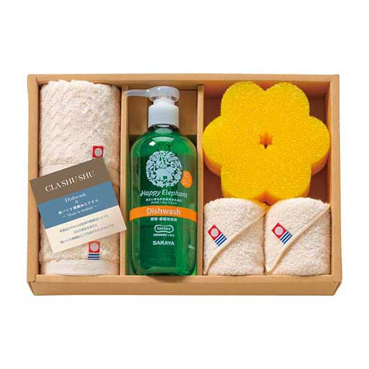●内容:ハッピーエレファント洗剤(食器用洗剤オレンジ&ライムの香り)300ml×1、タオルハンカチ×2、スポンジ×1、ウォッシュタオル×2